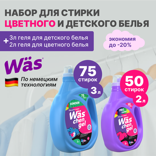 Гель для стирки цветного белья 2 л + гель для стирки детского белья 3 л Was / ВАС