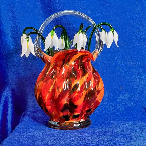 Подснежники стеклянные цветы 7 шт. + корзинка красная из цветного стекла 22 см