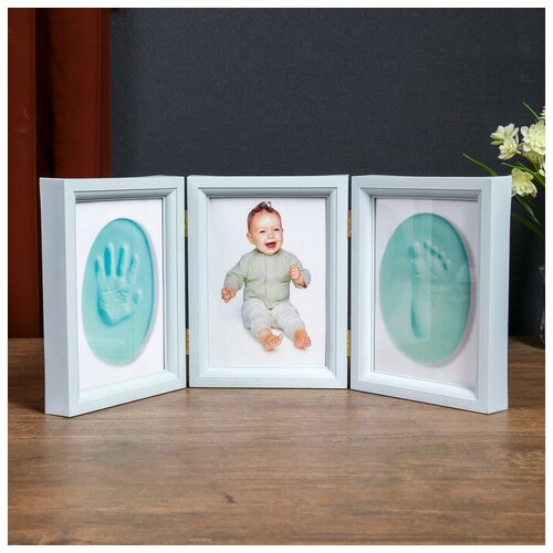 Фоторамка пластик 13х18 см с полим. глиной "Отпечаток ладошки и ножки" голубая 20,5х46,5 см (1шт.)
