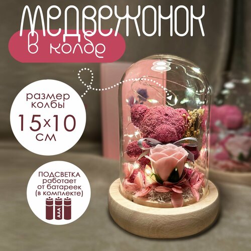 Медвежонок и роза в колбе с подсветкой