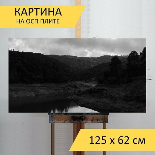 Картина на ОСП 125х62 см. "Лес, озеро, черное и белое" горизонтальная, для интерьера, с креплениями