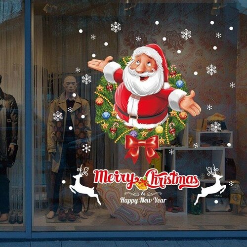 Интерьерная декоративная настенная наклейка "Дедушка мороз" улыбающийся Дед Мороз, рождественский венок. Цвет и зеленый. Размер на стене 80 на 80 см.
