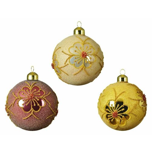 Набор стеклянных ёлочных шаров морозная энотера, золотой, перламутровый и розовый бархат, 8 см (упаковка 3 шт.), Kaemingk (Decoris)