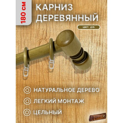 Карниз для штор однорядный 120 см. длиной. Точёные элементы карниза (кронштейны и кольца) выполнены из твёрдых пород древесины (бук, граб). Деревянные штанги 28 мм выполнены из материала сосна и тонированы в цвет Дуб. Карниз предназначен для крепления на стену. Для подвешивания штор есть удобные крючки с защёлками. Если длина карниза большая, можно штанги подпилить, срезы закроются кронштейнами. Расстояние от стены до штанги 8 см. Натуральные материалы создают здоровый микроклимат в доме и не вызывают аллергии.