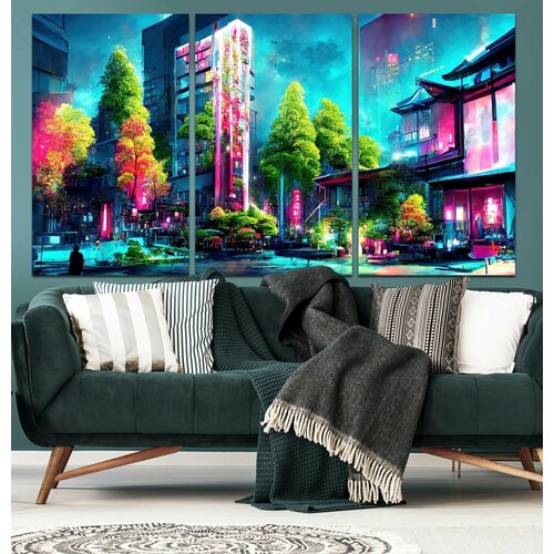 Модульная картина для интерьера на стену "Неоновый город" 100х180см На холсте ТРБ-0271