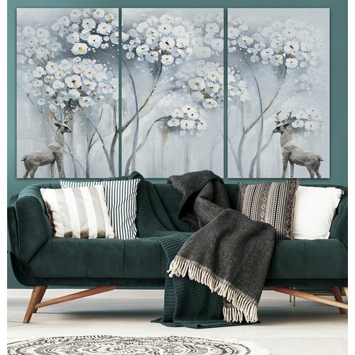 Модульная картина для интерьера на стену на натуральном холсте "Олени в цветущем саду" 100х180см ТРБ-0245