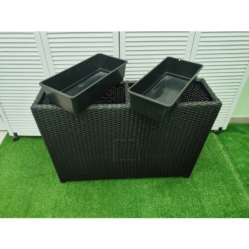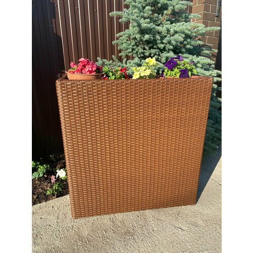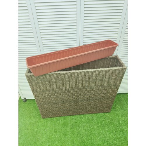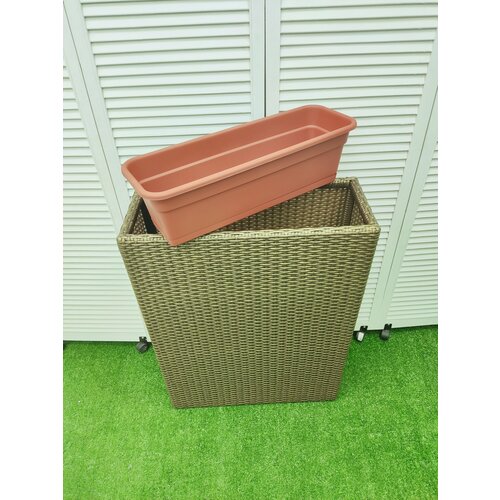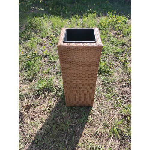 Кашпо напольное уличное выполнено из металла, окрашено порошковой краской и оплетено искусственным ротангом. Это обеспечивает высокую прочность и долговечность изделия, а также придает ему уникальный внешний вид.