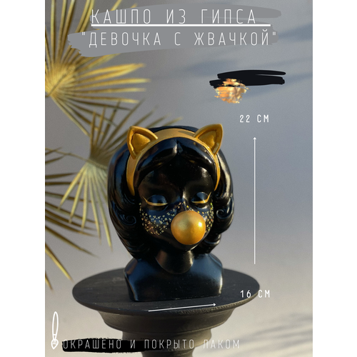 Кашпо Девочка с жвачкой из гипса в черном цвете с золотом, 22 см, органайзер ваза