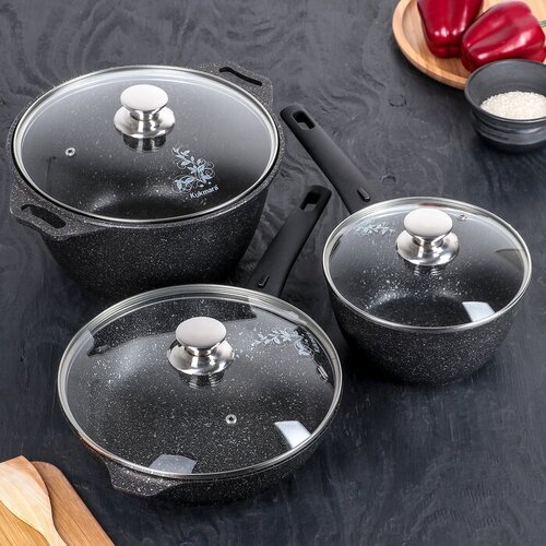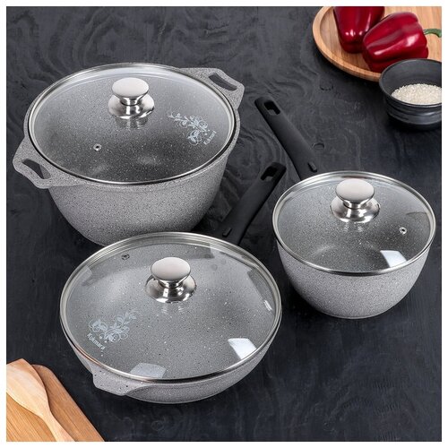 Набор кухонной посуды «Мраморная №3», 6 предметов, крышка, съёмная ручка, антипригарное покрытие, цвет тёмный мрамор