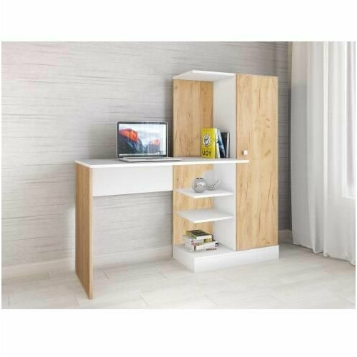 Стол компьютерный Квартет-6, ЛДСП, белый/дуб крафт золотой, 145x135x50 см, 1 ящик, 3 полки.