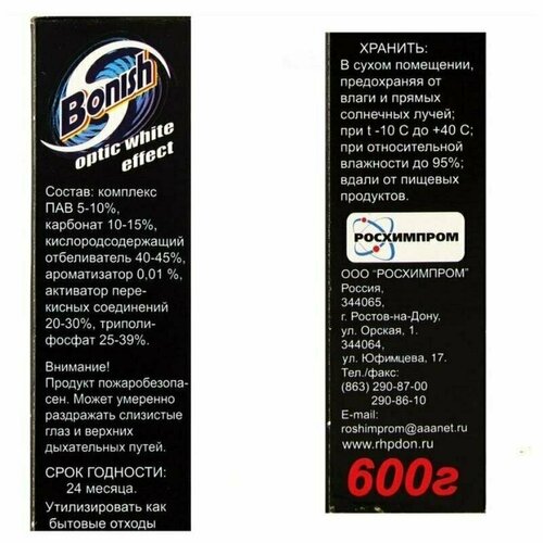 Внимание! Товар продается комплектом:[Средство для удаления пятен 600 г, BONISH (Бониш) "Optic white effect", без хлора] X 28 шт. Используется для стирки изделий из хлопчатобумажных, синтетических и смешанных волокон в стиральных машинах и ручной стирке. Удаляет самые стойкие пятна. Не содержит хлор и бережно относится к цветным и деликатным тканям.