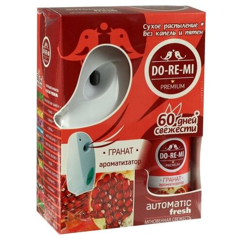 Автоматический диспенсер + 2 батарейки. В комплект "До-ре-ми" Премиум входит диспенсер и автоматический освежитель воздуха. Комплект освежителя воздуха До-Ре-Ми прекрасно освежит ваш дом от неприятных запахов. Автоматическое распыление без капель и пятен. Свежесть до 60 дней. Способ применения: откройте диспенсер, нажав на кнопку в верхней части устройства. Установите регулятор интенсивности. Вставьте 2 батарейки. Поднимите зеленый рычаг внутри устройства вверх, затем вставьте баллон носиком наружу. Установите желаемый интервал распыления, после чего сработает первое распыление. Закройте крышку диспенсера. Установите диспенсер в выбранное место на высоте не менее 2-х метрах пола. При смене баллона не направляя устройство в лицо, поверните регулятор в положение выкл и замените сменный аэрозольный баллон в соответствии с инструкцией выше. Меры предосторожности: баллон под давлением. Не распылять вблизи открытого огня и раскаленных предметов. Предохранять от воздействия прямых солнечных лучей и нагревания вы