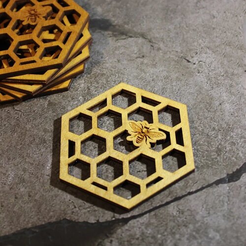 Комплект подставок под горячее, кружку, стакан, свечу - "Соты и пчела", 10 см х 10 см, 6 шт, из натурального дерева.