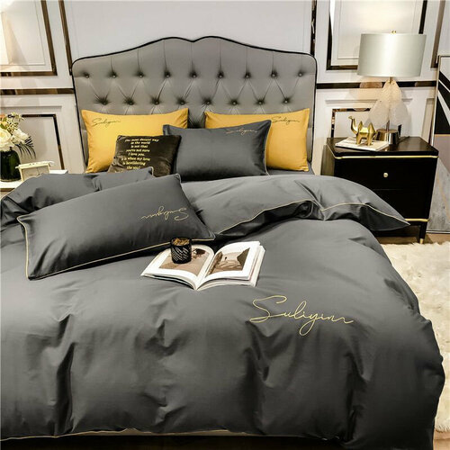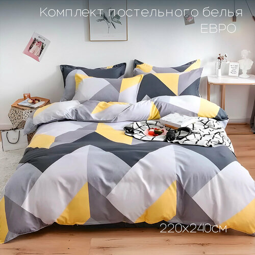 Постельное белье Сатин Евро с простыней на резинках по углам 4 Наволочки 70x70 50x70 Хлопок Aimee SAYA HOME Серый Желтый