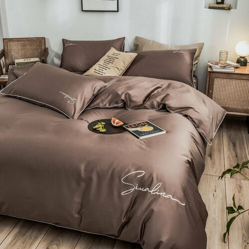 Комплект постельного белья из Поплина Семейный Mency House. 4 наволочки 70x70 и 50x70. Простыня на резинке по кругу. SAYA HOME. Коричневый