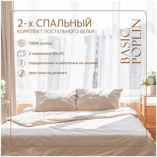 Комплект постельного белья ZonaSona с простыней на резинке, Бежевый, 2 спальный, поплин, наволочки 50х70 2 шт.