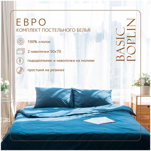 Комплект постельного белья ZonaSona с простыней на резинке, Синий, Евро, поплин, наволочки 50х70 2 шт.