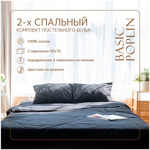 Комплект постельного белья ZonaSona с простыней на резинке, Графит, 2 спальный, поплин, наволочки 70х70 2 шт.