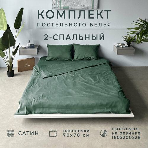 Комплект постельного белья ZonaSona с простыней на резинке, Тёмно-Зелёный, 2 спальный, сатин, наволочки 70х70 2 шт.