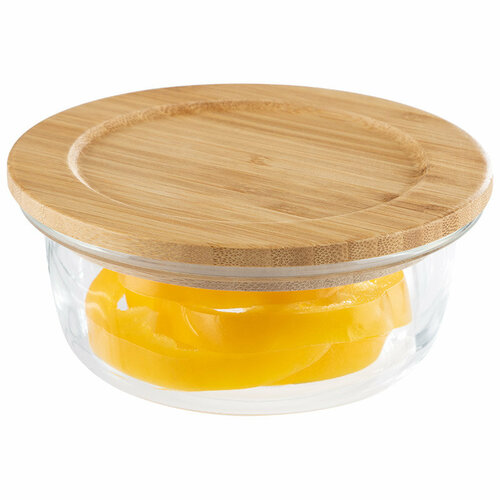 Контейнер для продуктов 400 мл из жаропрочного стекла с крышкой из натурального бамбука, круглый, 13х6 см