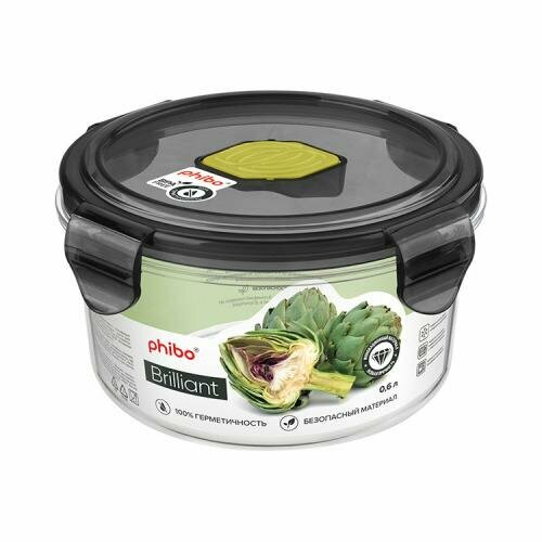 Контейнер для хранения продуктов , крышка герметичная с клапаном, тритан,0,6л, диаметр 140, высота 77мм, прозр, чер