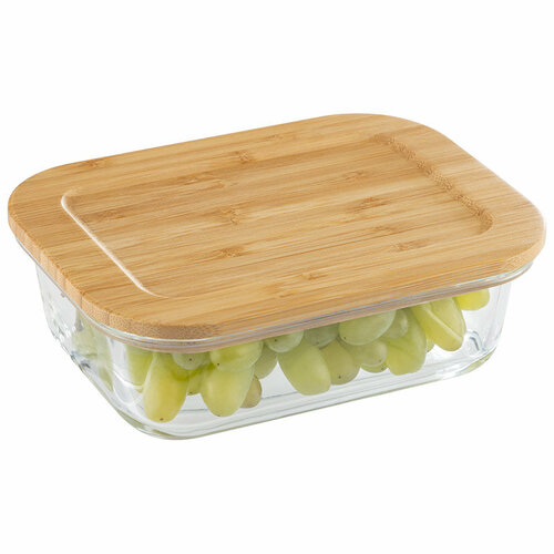 Контейнер из жаропрочного стекла объем: 600 мл, с крышкой из натурального бамбука, прямоугольный