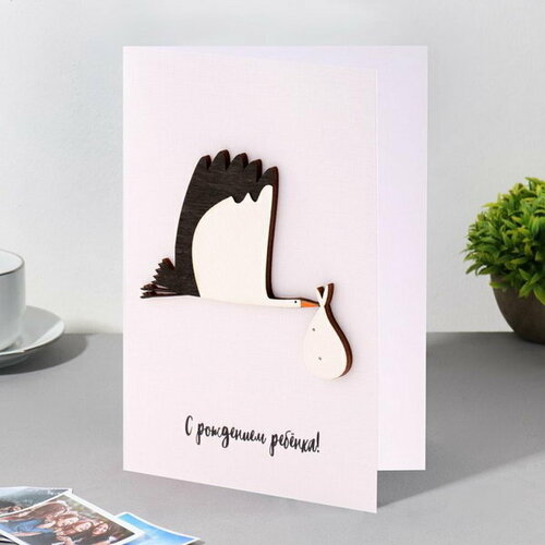 Открытка с деревянным элементом "С рождением ребенка!", ручная работа, аист, 14.7х10.5 см