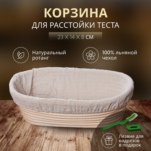 Выполнена из высококачественного и безопасного материала - лозы ротанга, который оптимально подходит для использования в процессе расстойки теста, при котором заготовка будет находится в благоприятном для нее микроклимате: получать достаточно кислорода, объем, рост, пористость, а также эстетический вид. Размер: 23x8 см. Вес: 300 гр. Вместимость теста: 750-800 гр. Форма: круг. Съемный чехол: 100% лен.