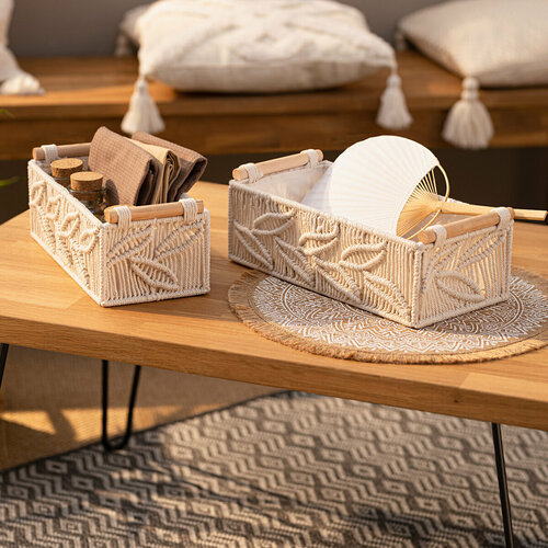 Корзинки сплетены из водного гиацинта и шпагата в коричневых тонах. Удобные боковые ручки. Размеры: диаметр 26 см х 23 см, диаметр 31 см х 26 см. В комплекте 2 корзины.