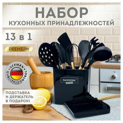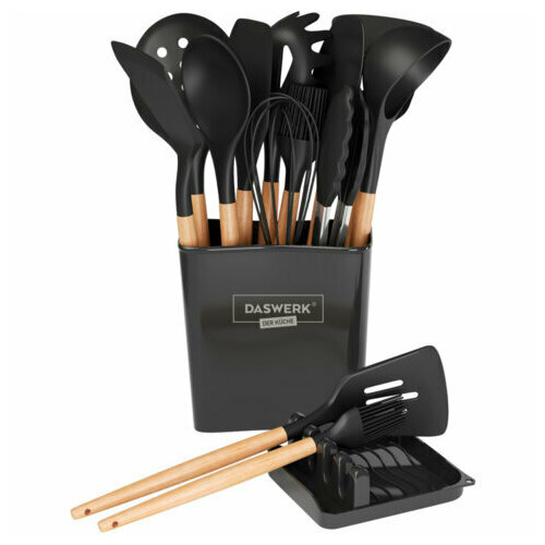 Набор силиконовых кухонных принадлежностей с деревянными ручками 13 в 1, черный, DASWERK, 608197