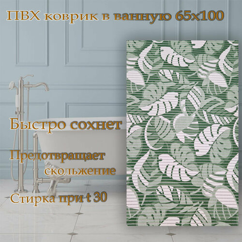 Коврик нескользящий для ванной и туалета ПВХ яркий 65*100 листья зеленые