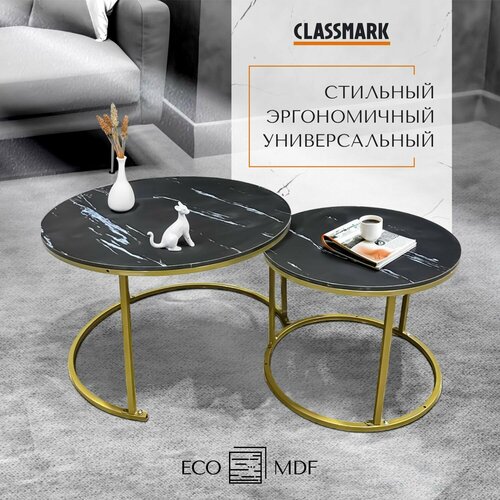 Журнальный столик круглый черный Classmark кофейный стол в гостинную и чайный, прикроватный лофт, МДФ, в комплекте 2 шт, 70 45 см и 50 38 см, цвет мрамор, золото