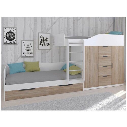 дуб, дуб светлыйДанная модель имеет значительные преимущества: оригинальное оформление, которое импонирует детям; безопасность – все элементы мебели имеют закрыты кромкой, отсутствуют острые углы и выступы; кровать оснащена бортиком безопасности, препятствующим падению во сне; функциональность – для ребенка обеспечивается максимальный комфорт благодаря удобному спальному месту размером 80*160 см, а также большие полки со стороны лестницы прекрасно подойдут для книг, поделки, игрушки; большой выбор вариантов комплектаций – поможет легко подобрать оптимальный вариант, для размещения игрушек, книжек, личных вещей, что с экономит пространство, так же вариант со столом избавит Вас от покупки отдельного стола для ребенка. Широкая гамма цветовых сочетаний подойдет под любой интерьер Вашего дома