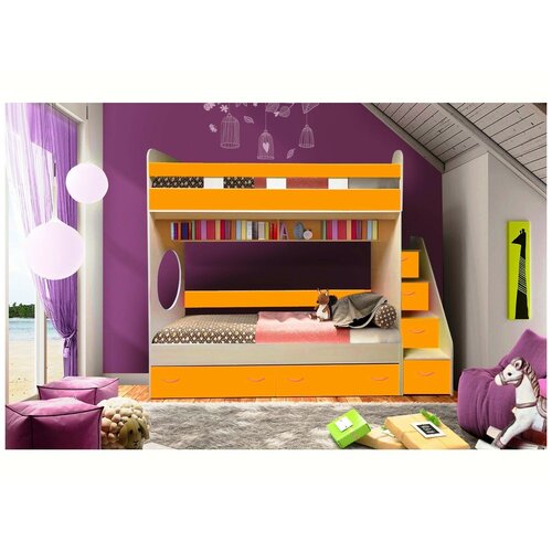 Двухъярусная кровать Юниор 1 (Оранжевый, Белое дерево)
