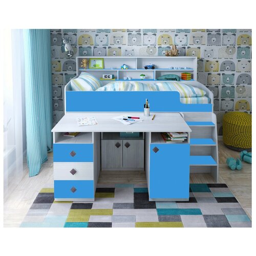 голубой, белыйКровать чердак Кадет 1 — это детская кровать, которая изготавливается только из проверенных и экологически чистых материалов. Красивая и модная кровать для детей сделает детскую функциональной и сохранит необходимое детям пространство. В угловом шкафу с распашными дверцами 4 полки и штанга длинной 80 см перпендикулярно задней стенке; 3 открытых полки над столом, одна открытая под столом и 3 выдвижных ящика. Основание спального места ЛДСП. Матрас приобретается дополнительно.