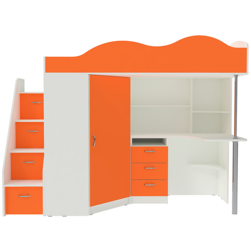 Удобный, компактный и функциональный комплект детской мебели, включающий кровать Малыш на «чердаке», комод, выдвижной стол, лестницу с выдвижными ящиками и отделение для игрушек на колёсах, который легко убирается под кровать. Удобное спальное место наверху со специальным ограждением для безопасности сделает сон комфортным. При желании можно нарастить бортик. Кровать чердак Малыш - это многофункциональный спальный комплекс, включающий детскую кровать Малыш на «чердаке», комод, выдвижной стол, лестницу с выдвижными ящиками и отделение для игрушек на колёсах, которое легко убирается под кровать. Удобное спальное место наверху со специальным ограждением для безопасности сделает сон комфортным. При желании можно нарастить бортик. На цветных фасадах: цвет кромки - бежевый. Детская кровать - чердак Малыш предназначена для ребёнка от 2 до 8 лет. Мебельная фабрика производит кровать чердак Малыш в различных цветах: такую кровать можно купить и для мальчиков, и для девочек. Дно кровати - щит ЛДСП. Матрас (пружинный