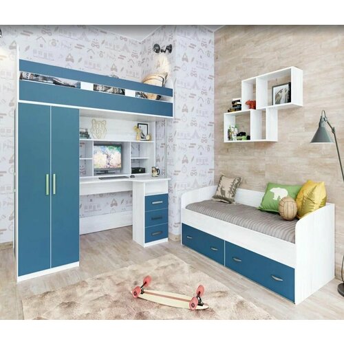Кровать-чердак Кадет 1 с металлической лестницей (Голубой, Белое дерево)