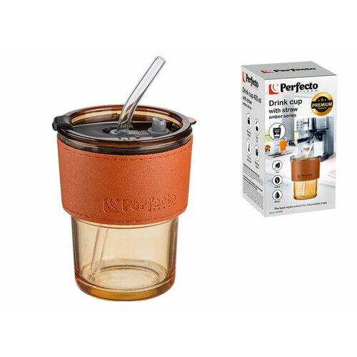 Стакан стеклянный для напитков с трубочкой и кожаным кейсом, 400 мл, Amber, PERFECTO LINEA (31-400200)