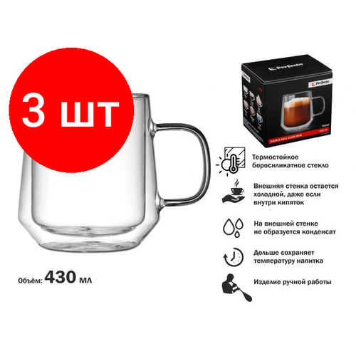 Комплект 3 штук, Кружка стеклянная с двойными стенками, 430 мл, серия Tagus, PERFECTO LINEA (Бокал стеклянный, ручной работы из боросиликатного стекла.) (30-354400)