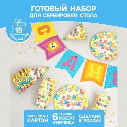 Набор бумажной посуды «Весёлые животные», 6 тарелок , 1 гирлянда , 6 стаканов, 6 колпаков
