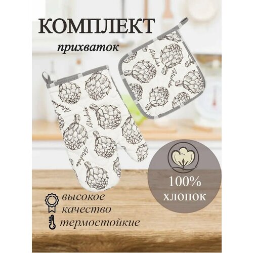 Набор декоративных прихваток для кухни, квадратная прихватка размер (20*20), рукавичка (30*17), текстиль для дома, 100% хлопок. Артишоки.