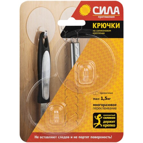 бесцветный, прозрачныйКрючки на силиконовом креплении 6.8х6.8, 2 шт. Сила Б0002522 - изделия многоразового использования, применяемые в быту для крепления на поверхности различных предметов. Максимальная нагрузка составляет 1.5 килограмм. Крючки отличаются многоразовым использованием, не оставляют следов и не повреждают гладкую поверхность.