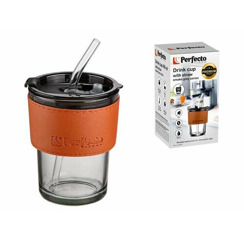 Стакан стеклянный для напитков с трубочкой и кожаным кейсом, 400 мл, Smoke Grey, PERFECTO LINEA (31-400100)