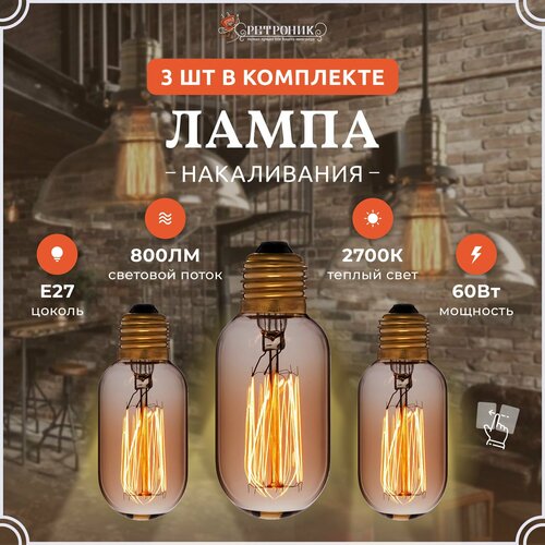 Лампочка Эдисона, лампа накаливания Е27 60W 2700К, комплект 3 шт