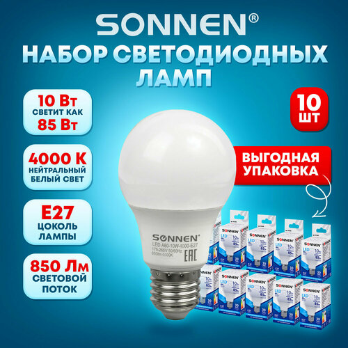 Светодоиодная лампа (лампочка) LED (ЛЕД) для люстры, светильника 10 шт, Sonnen, 10 (85) Вт, цоколь Е27, груша, нейтральный белый свет, 880794