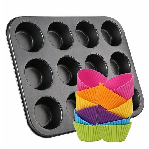 Противень / Противень и силиконовые крышки 12шт. / Форма для кексов / Форма для маффинов / Форма для кексов с силиконовыми вставками 12 ячеек