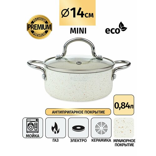 Кастрюля c крышкой Royalty Chef кремовая. Объем 0,84 литра. Антипригарное покрытие, стеклянная крышка, материал алюминий. Диаметр 14 см.