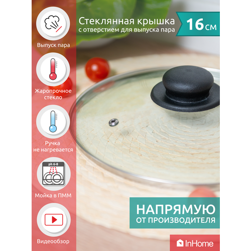 Крышка InHome стеклянная с пароотводом и металлическим ободом IJLP, 16 см, 1 шт.