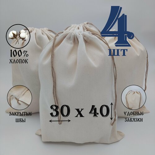 Хлопковый мешочек с джутовыми завязками 30 на 40 см./ 4 шт./ упаковка для подарков и хранения