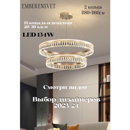 Люстра подвесная хрустальная из двух колец для гостиной, 134 Вт, кол-во ламп: 2 шт, цвет: